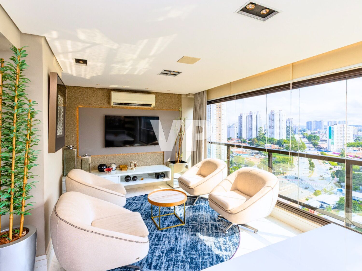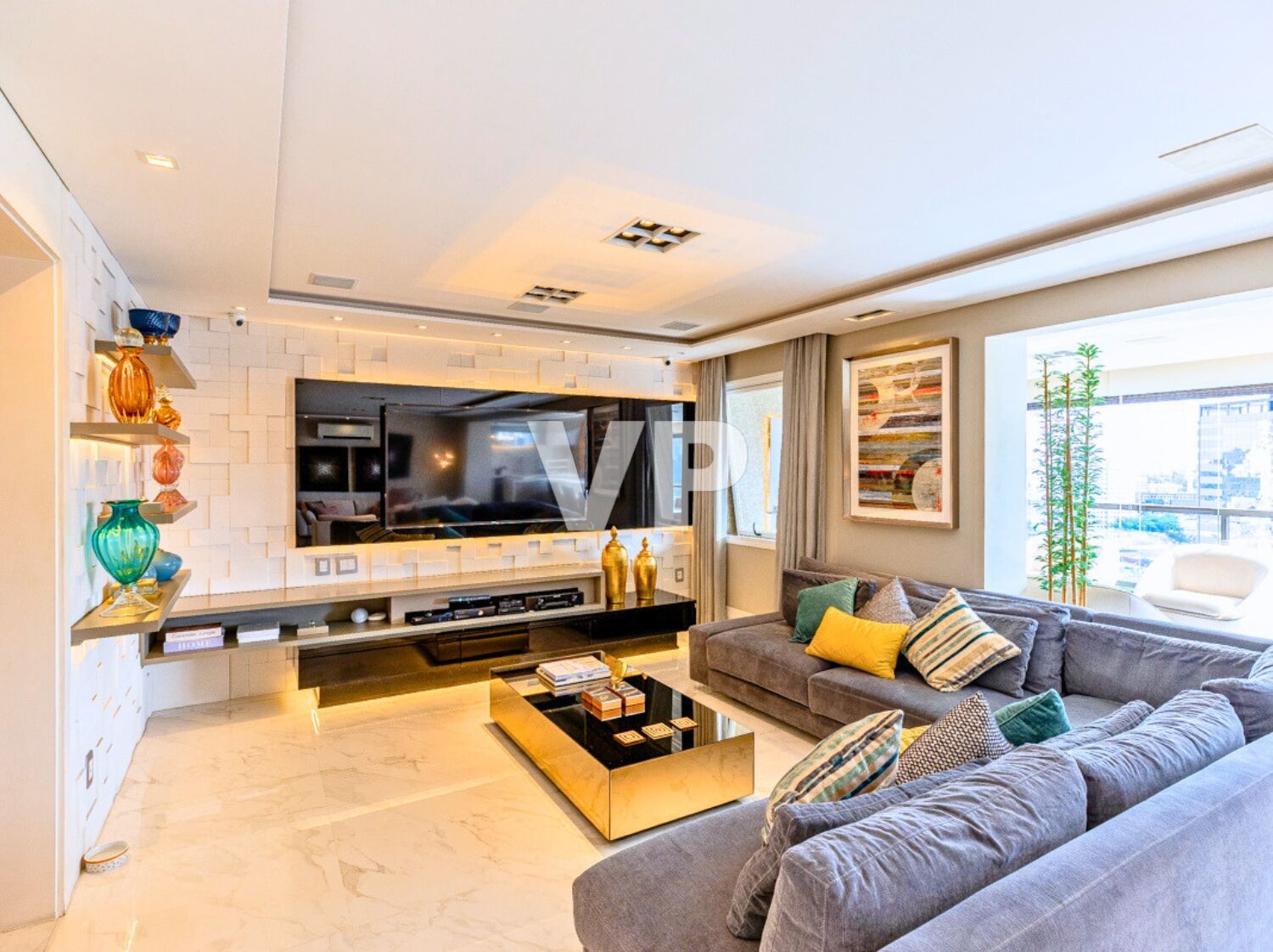 Apartamento de alto padrão com 209m², em andar alto e com hall privativo, projetado para quem valoriza sofisticação, conforto e tecnologia em cada detalhe. A área social apresenta uma ampla sala para dois ambientes integrada à varanda gourmet com churrasqueira, formando um espaço elegante e ideal para receber.