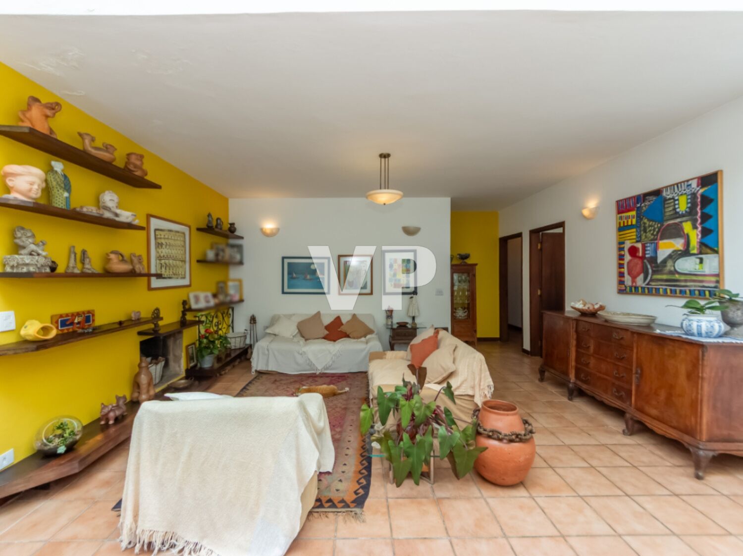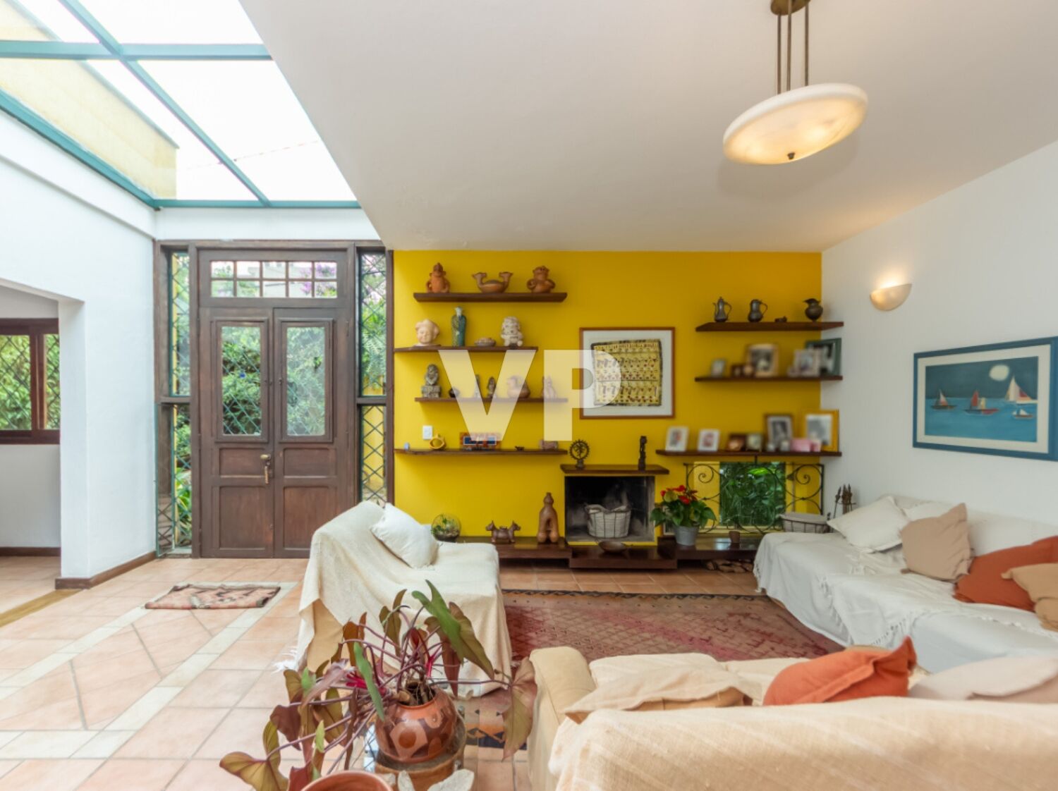 As salas são amplas, iluminadas e se conectam diretamente ao jardim, proporcionando um ambiente perfeito para relaxar ou receber. O hall com cobertura em vidro permite a entrada abundante de luz, trazendo leveza e um toque de sofisticação ao espaço.